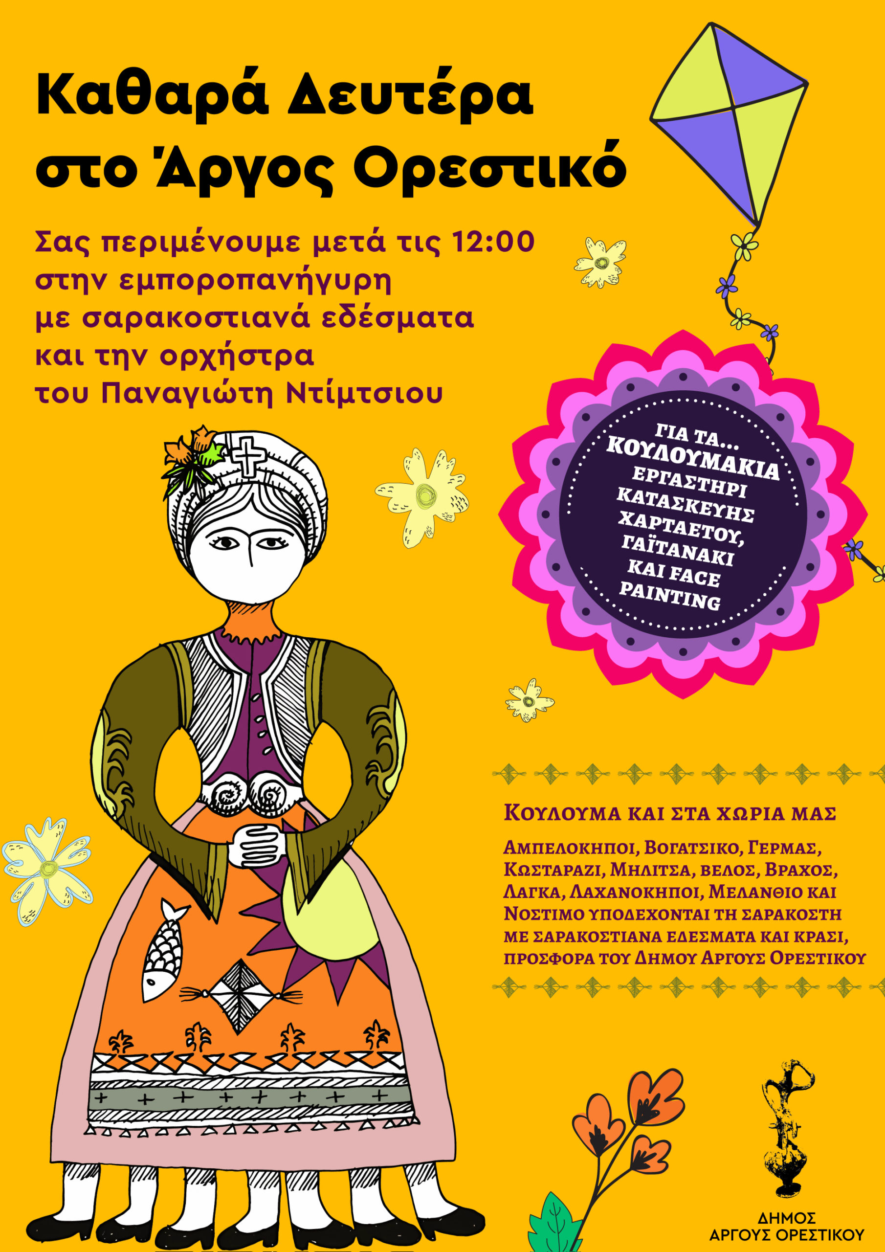 Την Καθαρά Δευτέρα, σας περιμένουμε στο χώρο της Εμποροπανήγυρης μετά τις 12:00, για να γιορτάσουμε μαζί με παραδοσιακή φασολάδα, σαρακοστιανά εδέσματα, κρασί και ζωντανή μουσική από την ορχήστρα του Παναγιώτη Ντίμτσιου, προσφορά του Δήμου Άργους Ορεστικού!